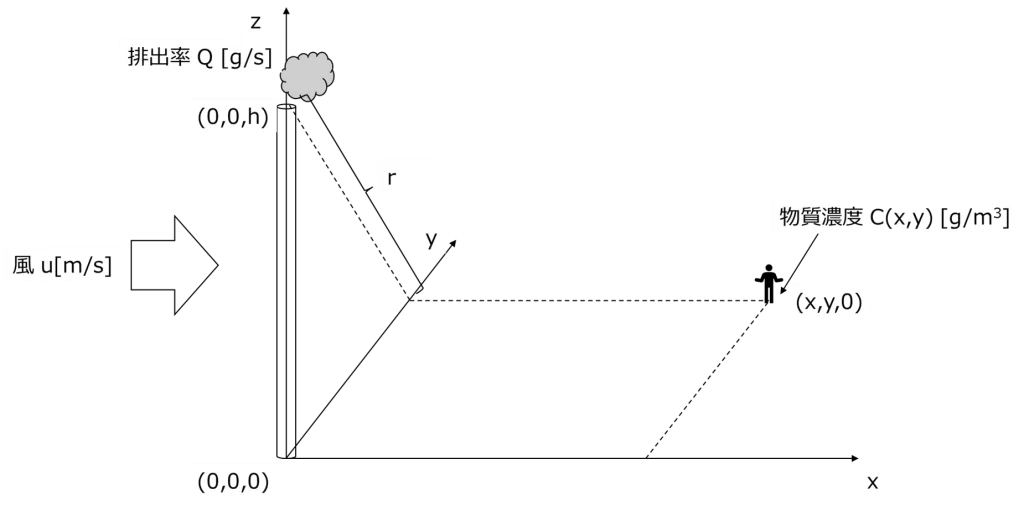 これらパラメータと、文献式(2)の座標設定の考え方を図にまとめると下のようになります。(0,0,h)から汚染物質が放出されたとき、地上の位置(x,y,0)における物質濃度を表しているということになります。