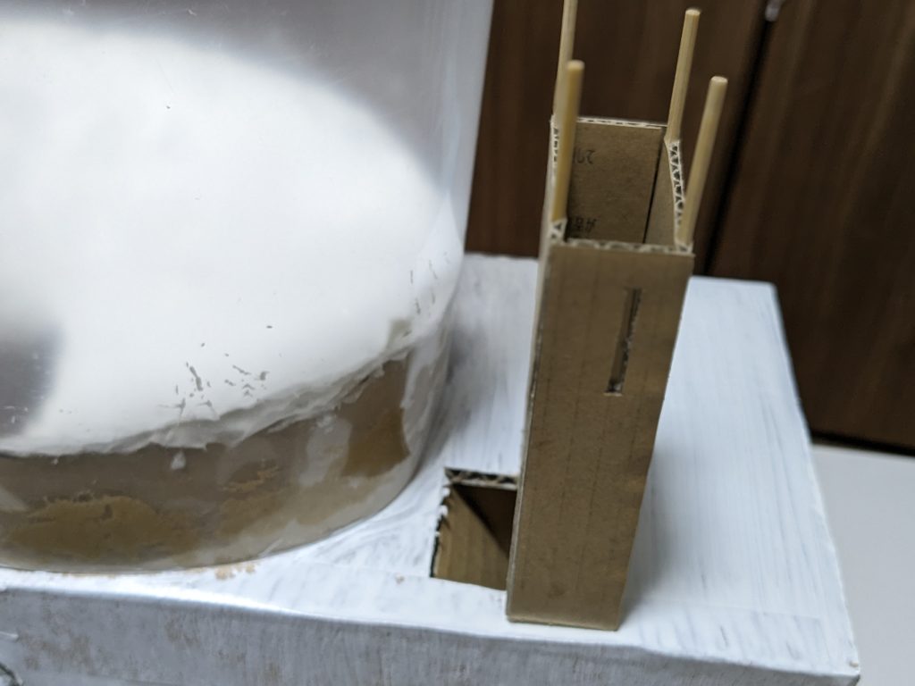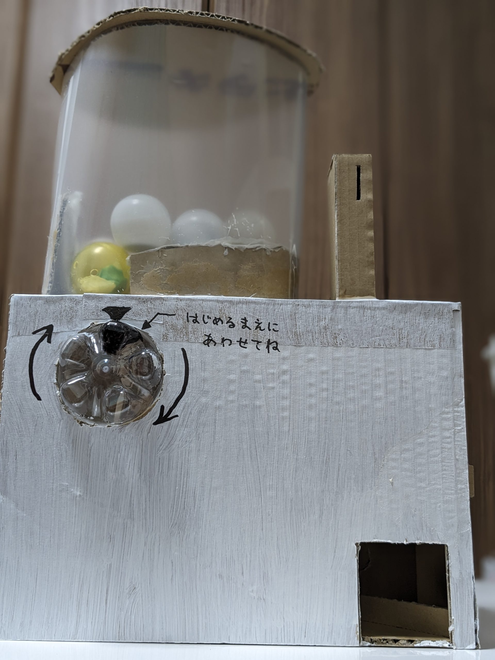 カプセルを入れる底の部分は、荷造りロープやティッシュ、ペンキなどを使って、カプセルがスムーズに転がるように少し傾斜をつけて作りました。(この部分は作る人の工夫で色々できそうですね!)