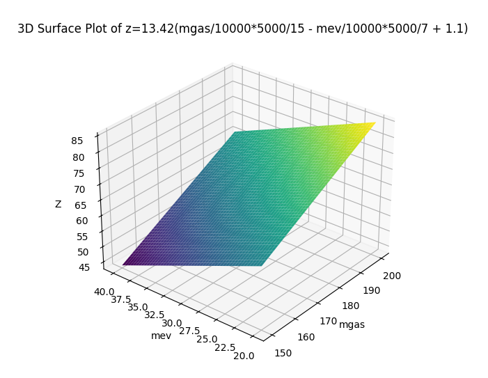右辺をまるっとzとおき、${z=13.42\times (\frac{m_{gas}}{10000} \times \frac{5000}{15}-\frac{m_{ev}}{10000} \times \frac{5000}{7}+1.1)}$を大真面目にmgas, mev, z座標空間にプロットすると、次のような図になります。