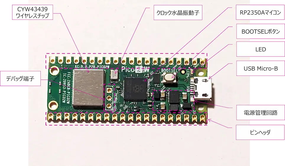 ということで、今回は焦って何かを作る前に、私自身の「ラズパイPico 2Wへの第一歩」として、まずはこのボードがどんなパーツで構成されているのか、じっくり観察してみることにしました。