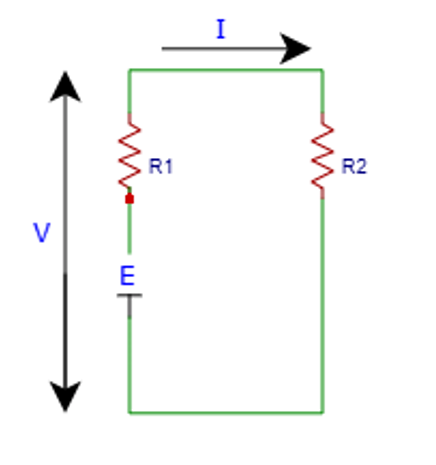 この図でいうEが起電力で、これがいま1.5Vです。電池を何らかの機器に接続して使うわけですが、その機器の抵抗をいま、まるっとR2として表してます。