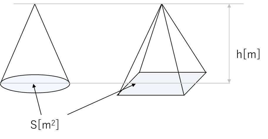 - (柱体と同じ底面積・高さでも、先が尖っている錐体は柱体のちょうど1/3の体積になる)