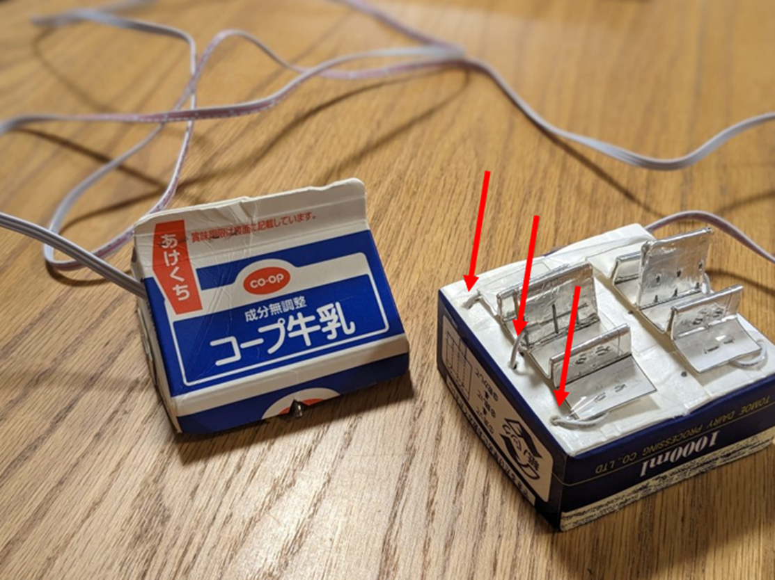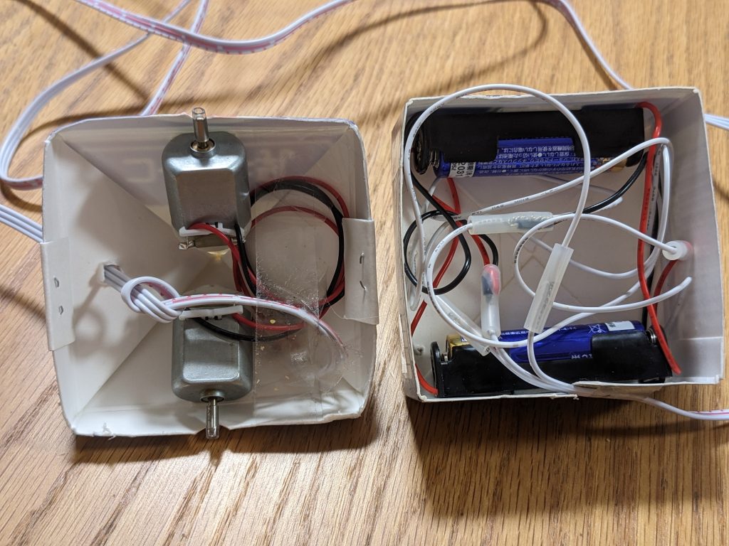 上の写真右側に写っている2つのスイッチを前後に倒すことで、下写真左側に写っている2つのモーター(タイヤ)の回転向きをコントロールして、車に見立てた牛乳パックを前後に動かしたり旋回させたりするというものです。