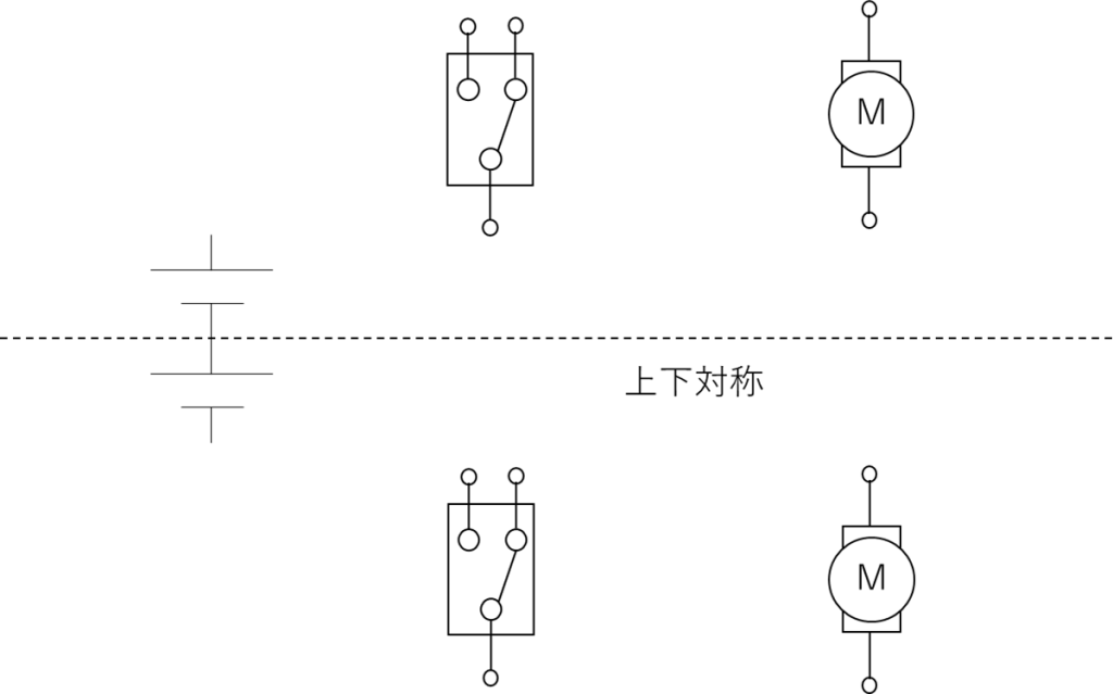 どういうことかというと、対称性のある回路図の完成を目指すということです。左右対称、もしくは上下対称です。これは好みがわかれるところかもしれませんが、基本的に電池はプラス側を上、マイナス側を下に向けて配置するのが自然なので、直列接続した2つの電池を(このリモコンカーは2つの電池を直列につないでます)回路図上で縦に配置するとなった時点で、上下対称の回路図になるだろうと予想がつきます。こんな感じです。