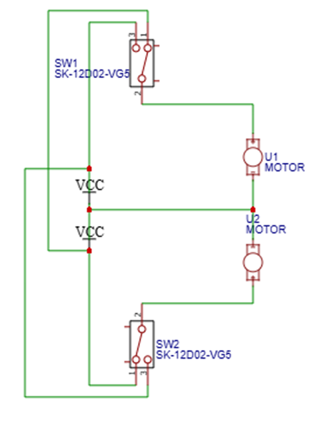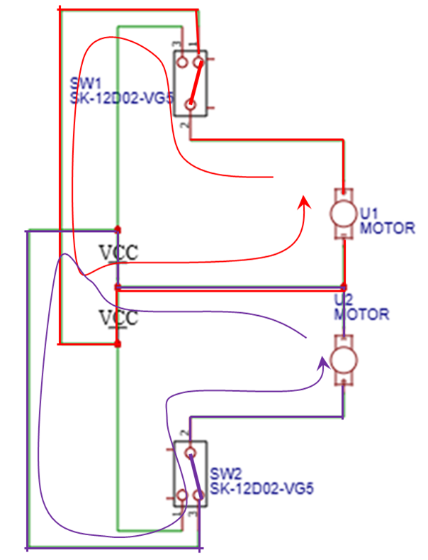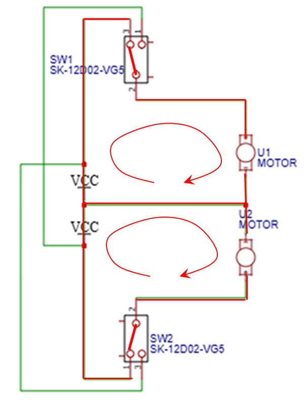 まずはこちらです。赤線が電流の通り道です。ループが2つ描かれていますが、この電流経路によって、モーター${U_1}$と${U_2}$がそれぞれ回転します。緑線には電流は流れません。これは、スイッチ部分で経路が途切れているからですね。